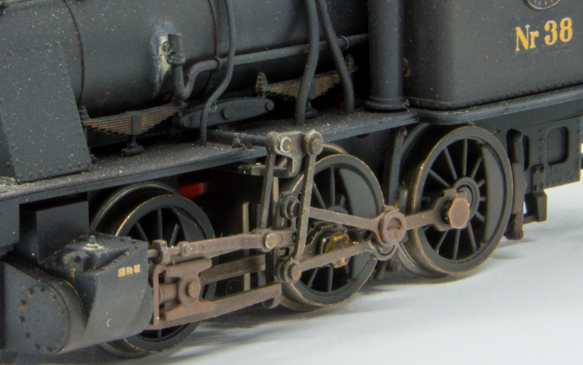 Hjul og gangtøj har jeg patineret med et ganske tyndt lag rustbrun, som jeg har påført med airbrush, mens hjulene var i bevægelse. Selv om jeg kalder farven rustbrun, kan den også bruges som bremsestøv eller almindeligt støv, der er hvirvlet op fra sporet. Jeg forberedte modellen ved at sætte den på en lille stump spor, og placerede en træklods foran den, så jeg kunne sætte hjulene i bevægelse uden, at den flyttede sig. Efter det tynde lag rustbrun, forseglede jeg med et tyndt lag ultramat klar lak fra Ammo.