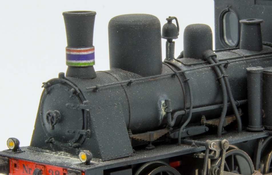 Efter tørring og før lakering er det perfekte tidspunkt at tilføje kedelbånd. De er skåret ud af elektrikertape i en bredde på 0,5mm og placeret på modellen med pincet. Placeringen er gjort i henhold til forbilledet.
